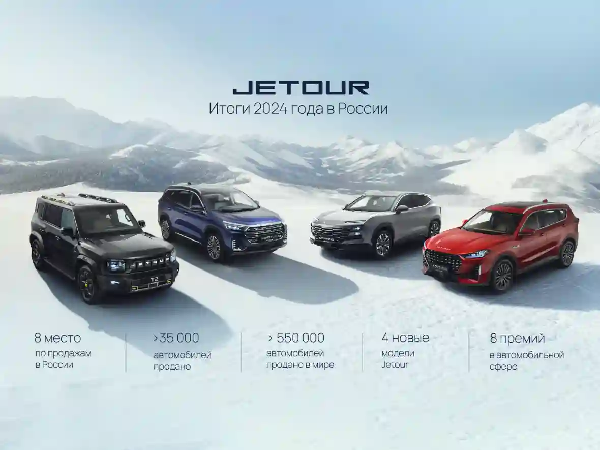 JETOUR подвел итоги своей работы в 2024 году в России и на глобальном рынке. За это время на российском рынке бренд представил 4 новых модели и укрепил позиции в рейтинге самых востребованных автомобильных брендов в РФ. Суммарно по итогам года JETOUR уверенно занял восьмое место по объему продаж на рынке. Всего в 2024 году в России было продано более 35 000 новых автомобилей JETOUR. Доля бренда на российском автомобильном рынке составила 2,23%.